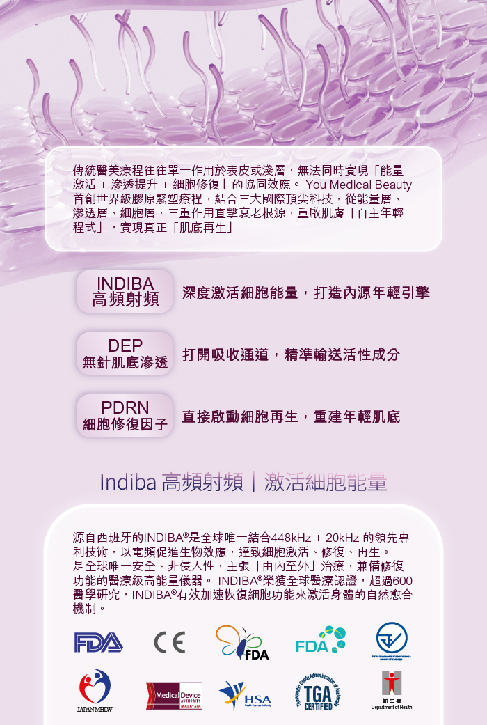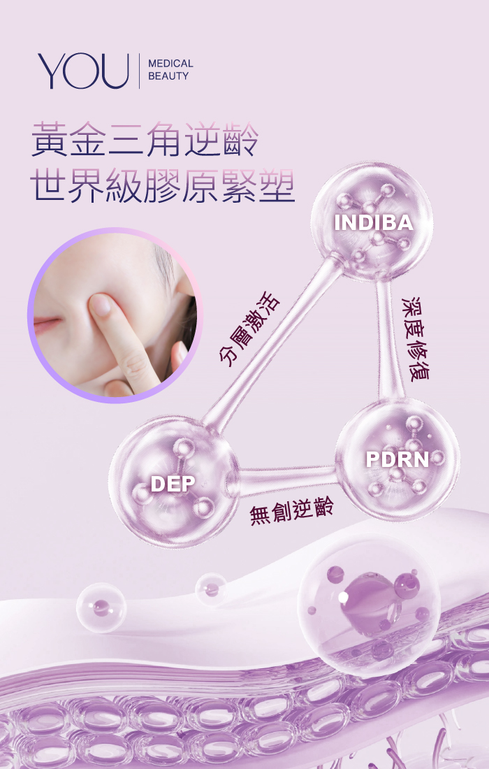 You Medical Beauty 世界級膠原緊塑療程結合 Indiba × DEP × PDRN 黃金三角逆齡,以分層激活・深度修復・無創逆齡,協同效應極大化,達到真正的膠原再生、緊緻肌膚、撫平皺紋、重塑輪廓。