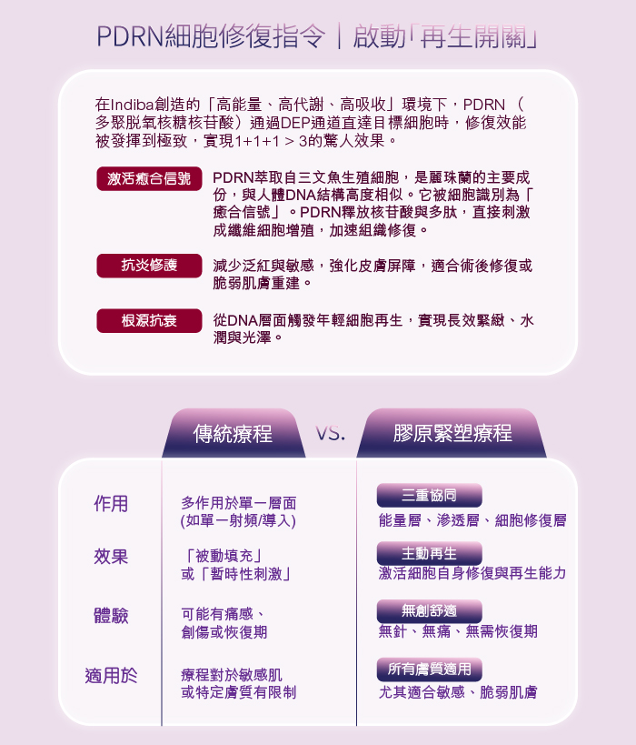關鍵在於「順序」與「技術等級」。Indiba的細胞激活能力遠超普通射頻,且我們嚴格控制在最佳溫度後才進行DEP無針肌底滲透導入,確保成分最高效吸收,而非簡單的疊加。